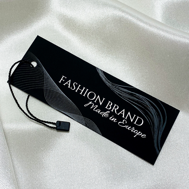 Klädetikett gjord av kartong, försedd med dragsko -försegling, anpassad med olika texter och tillverkarens logotyp. Denna typ av hängetikett är tillverkad av högkvalitativa material, med hjälp av de mest avancerade teknikerna inom digital utskrift och efterbehandling.