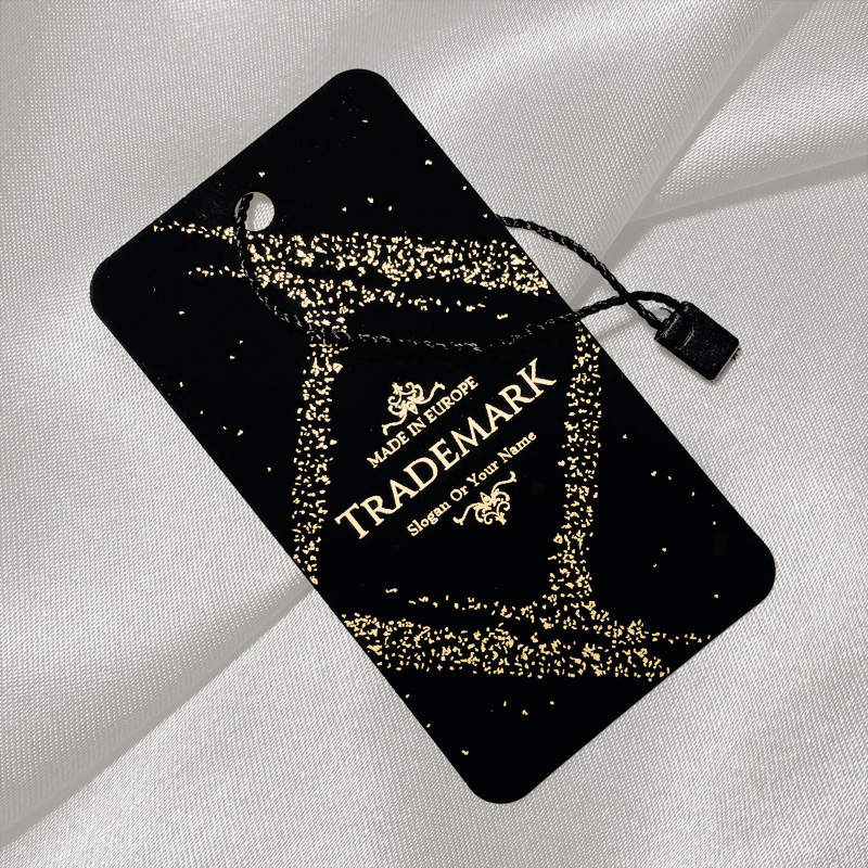 Pappetikett med tätning för kläder eller olika klädesplagg, modell HT-M97, tillverkad av mjuk kartong med specialfolie, med sammeteffekt och guldskrift. Denna typ av hängetikett är tillverkad av högkvalitativa material, med hjälp av de mest avancerade teknikerna inom digital utskrift och efterbehandling.