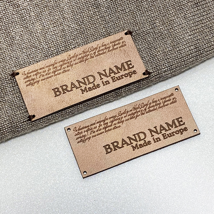 Anpassad etikett i naturligt läder, lasergraverad och skuren enligt de mått som visas.