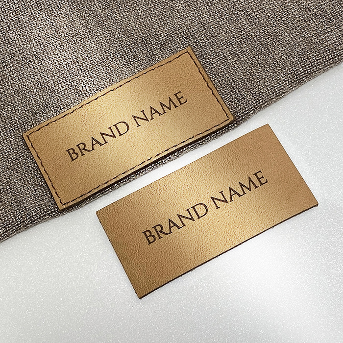 Anpassad etikett i naturligt läder, lasergraverad och skuren enligt de mått som visas.