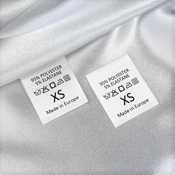 Tvättrådssetikett tryckt på vit satin med tvättsymboler, materialkomposition och storleksindikator, med kanter klippta med hjälp av ultraljud. Denna typ av textilmärkning är tillverkad med hjälp av de mest avancerade teknikerna inom det digitala tryckområdet på ett textilt stöd. Etiketterna är tryckta på en speciell satin genom termisk överföringsmetod, med en imponerande utskriftskvalitet och hög tvättålighet.