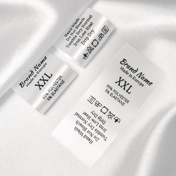 Skräddarsydd tvättetikett på fin vit satin, lämplig för kläder, andra klädesplagg och textilprodukter. Denna typ av textilmärkning är tillverkad med hjälp av de mest avancerade teknikerna inom det digitala tryckområdet på ett textilt stöd. Etiketterna är tryckta på en speciell satin genom termisk överföringsmetod, med en imponerande utskriftskvalitet och hög tvättålighet.