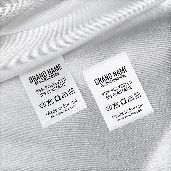 Tvättrådsetikett anpassad med varumärke, tygkomposition, tvätt- och skötselsymboler, tryckt på vit satin och kanter skurna med hjälp av ultraljud. Denna typ av textilmärkning är tillverkad med hjälp av de mest avancerade teknikerna inom det digitala tryckområdet på ett textilt stöd. Etiketterna är tryckta på en speciell satin genom termisk överföringsmetod, med en imponerande utskriftskvalitet och hög tvättålighet.