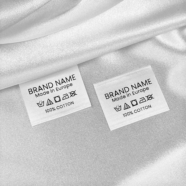 Textiletikett för kläder och klädtillbehör, gjord av vit satin, som innehåller tvätt- och skötselsymboler och tygkomposition. Denna typ av textilmärkning är tillverkad med hjälp av de mest avancerade teknikerna inom det digitala tryckområdet på ett textilt stöd. Etiketterna är tryckta på en speciell satin genom termisk överföringsmetod, med en imponerande utskriftskvalitet och hög tvättålighet.