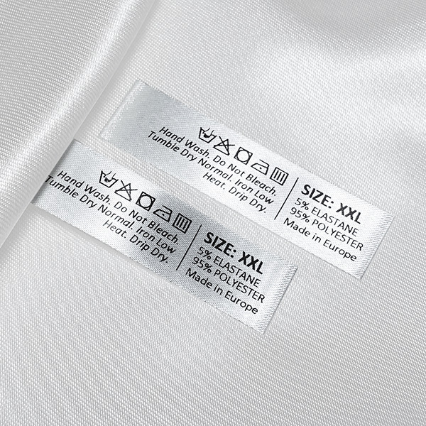 Personlig satinetikett för märkning av kläder med skötsel- och underhållsinformation, inklusive tvättsymboler, sammansättning och storlekar. Denna typ av textilmärkning är tillverkad med hjälp av de mest avancerade teknikerna inom det digitala tryckområdet på ett textilt stöd. Etiketterna är tryckta på en speciell satin genom termisk överföringsmetod, med en imponerande utskriftskvalitet och hög tvättålighet.